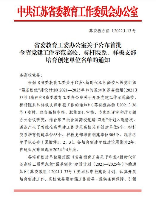 5月7日,江苏省委教育工委印发了《关于公布首批全省党建工作示范高校、标杆院系、样板支部培育创建单位名单的通知》(苏委教办函〔2022〕13号),物电院光电工程系教工党支部入选首批全省党建工作样板支部培育创建单位。