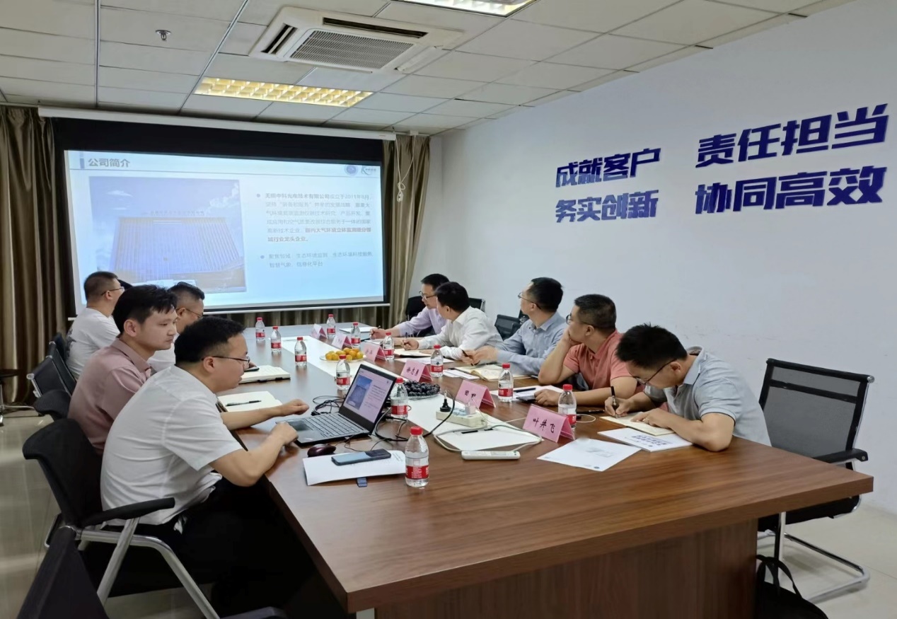 随后,学院一行前往无锡中科光电技术有限公司进行走访调研,该公司是是集大气环境高端监测仪器技术研究、产品开发、集成应用和空气质量改善综合服务于一体的国家高新技术企业。在该公司政府事务总监周剑烽的带领下,学院一行参观了公司展厅、不同类型激光雷达产品产线、设备装配工作室等,了解了该公司的产品类型与技术优势。座谈会上,周剑烽总监代表公司对学院一行表示热烈的欢迎,回顾了公司的发展历程,着重介绍了公司的主营范围和人才优势,涂兵副院长表示,希望以此次交流访问为契机,进一步拓展学院与中科光电的合作,双方就学生就业、项目合作等方面充分交换了意见。