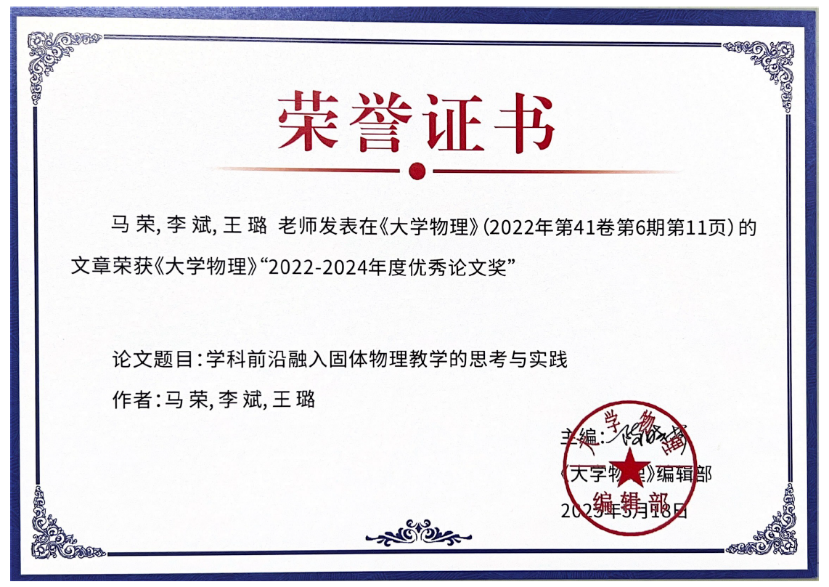 近日,《大学物理》期刊编辑部根据文章引用量、下载量等数据,对三年(2022-2024年)中该期刊发表的700多篇文章进行了评选,物理与光电工程学院马荣和王璐老师合作发表的教学论文《学科前沿融入固体物理教学的思考与实践》荣获《大学物理》“2022-2024年度优秀论文奖”。