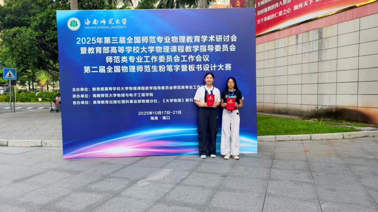 10月17日-19日,第二届全国物理师范生粉笔字暨板书设计大赛在海南师范大学举行,由物理与光电工程学院负责选拔与培训的我校学生在此次比赛中获得好成绩,其中王欣瑶同学在研究生组中获得一等奖,钱思思同学在本科生组中获得二等奖。