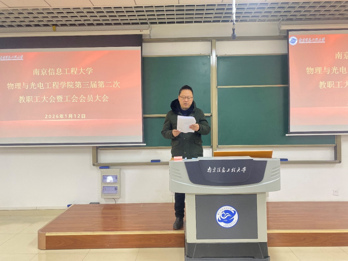 2026年1月12日,物理与光电工程学院第三届第二次教职工代表大会暨工会会员大会在藕舫楼N205隆重召开。学院领导班子成员、教职工代表及工会会员参加会议。会议由学院党委书记徐志勇主持。