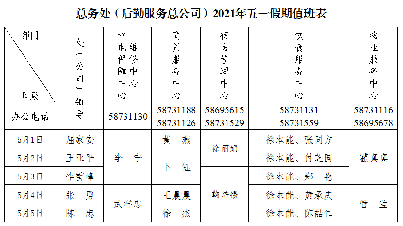总务处(后勤服务总公司)五一假期值班表