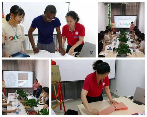 宿管生活老师毛升翠结合日常走访学生房间的案例,把衣物洗涤、防潮驱虫及收纳通过幽默风趣的语言、鲜活生动的实例进行讲解,赢得现场同学们的频频掌声。生活老师方玉从巧用折叠节省衣柜空间的角度,为同学们现场演示常用衣服的折叠方法,她不同寻常的折叠方法深深地吸引住同学们的目光,赢得同学们阵阵惊叹!在赞叹的同时,他们纷纷拿起课程准备的衣服开始现场实践操作,在老师们手把手的指导下,同学们很快领会到每一种折叠手法的要领。