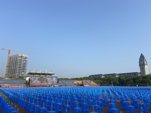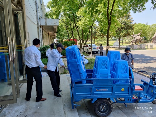 在毕业典礼前一周,总务处(后勤服务总公司)召开了毕业典礼保障专题会议,详细部署保障任务和具体工作要点,会后物业服务中心根据总务(后勤)的要求,制定了详尽的保障方案。工程部对田径场贵宾室重新粉刷,保洁人员对田径场内外环境彻底保洁。此次保障任务最繁重、最能体现服务水平和档次的要数在毕业典礼前一天在整个田径场要横竖斜都要成直线地摆放8652张塑料凳,同时在毕业典礼当天凌晨4点开始要将在每一张凳子上整齐地摆上一瓶矿泉水。