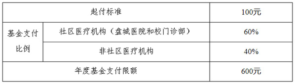 3.普通门诊统筹待遇:一个自然年度内大学生发生门(急)诊医疗费用,起付标准100元,在社区医疗机构及校医疗机构就诊的,基金支付比例60%,非社区医疗机构就诊的,基金支付比例40%;年度基金支付限额600元。