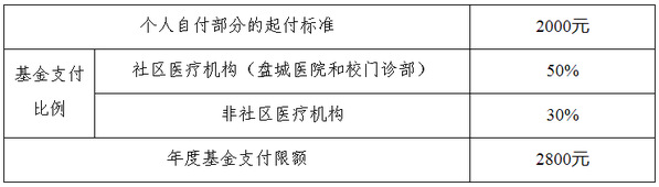 5.门诊高费用可享受补偿待遇:一个待遇年度内,享受完门诊统筹待遇后,继续发生的门诊医疗费用,个人自付2000元以上部分,享受门诊高费用补偿待遇。在社区医疗机构及校医疗机构就诊的,基金支付比例50%,非社区医疗机构就诊的,基金支付比例30%,年度基金支付限额2800元。