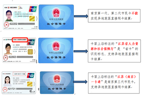 2.参保地就医直接刷医保卡结算,异地就医需办理异地就医备案后持省卡或三代卡结算(含门诊急诊和住院)。办理异地就医备案方式为:通过“我的南京”APP进行异地就医备案(我的南京-健康-医保服务-异地就医备案-选择“正常备案”或“承诺备案”均可),成功后持省卡或三代卡就诊结算(未持有省卡或三代卡(见下图)的同学可选择自行前往人社网点(江北新区丽景路2号)或参保地社保卡所属银行办理升级)。