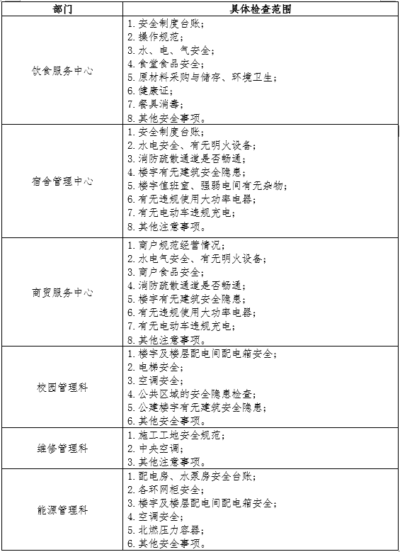 检查场所主要包括学生公寓、食堂、校园商贸服务场所、楼宇建筑物、各施工作业工地、特种设备场所(中央空调、电梯)、配电房水泵房等。