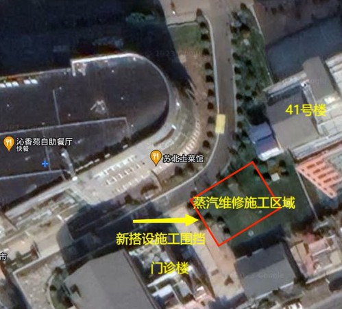 因学校西区蒸汽管线漏水维修施工,为确保施工安全,将于8月5日起对西区北换热站南侧区域、门诊楼东侧区域进行临时围挡(详见下图红线),围挡封闭时间约15天。
