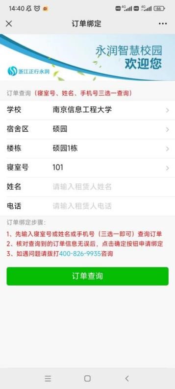 2、订单查询,使用微信扫描上方二维码,根据房间号/姓名/手机号(三选一即可查询)查询订单信息。