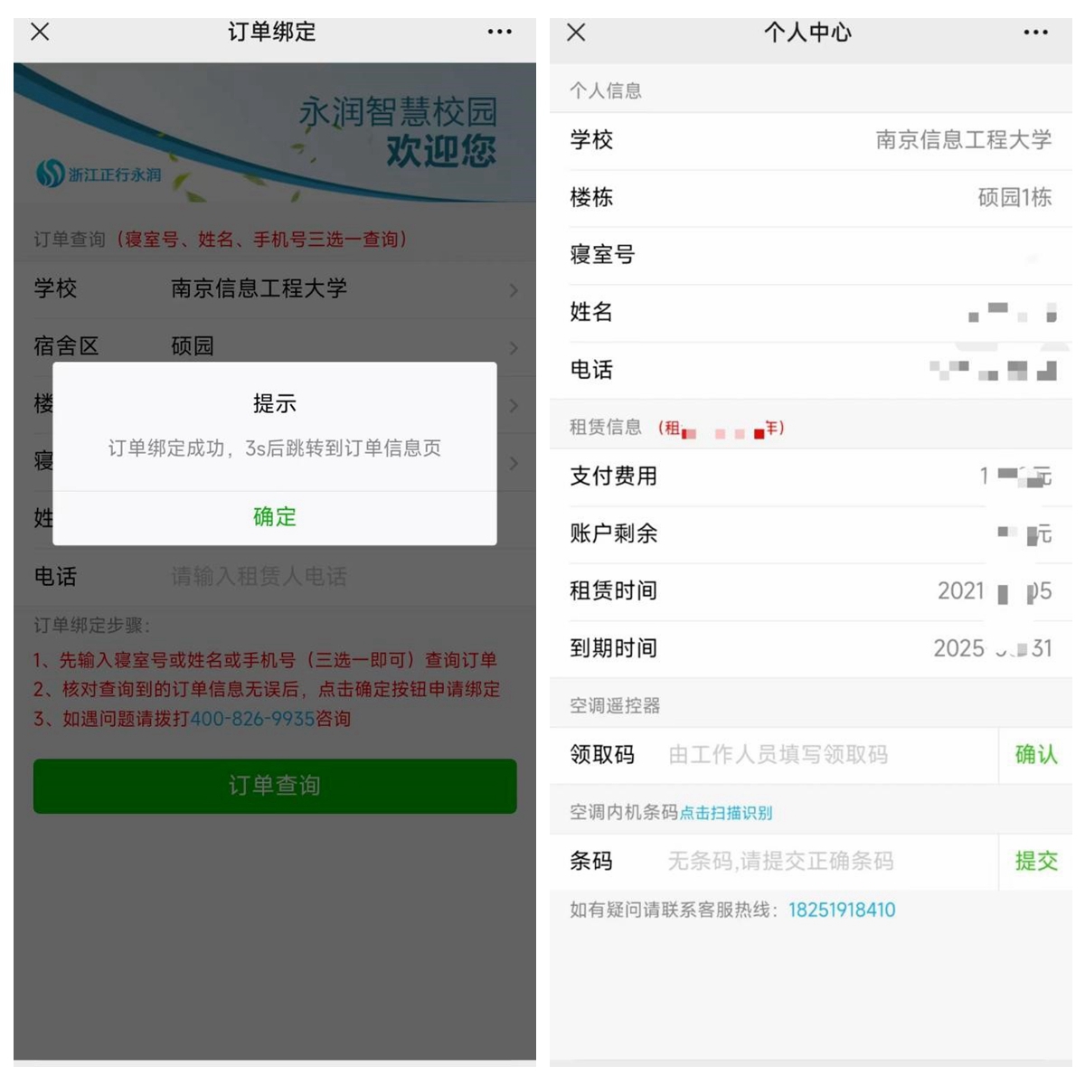2023年暑期我校空调租赁服务商更换为浙江正行永润科技有限公司,原空调租赁服务内容由新公司继续履行。为更好开展空调服务,及时响应广大同学空调服务需求、诉求,请各位同学微信绑定空调服务商“永润智慧校园”小程序,及时核对本宿舍剩余空调租赁年限及金额,并绑定对应宿舍房号,具体办理须知如下: