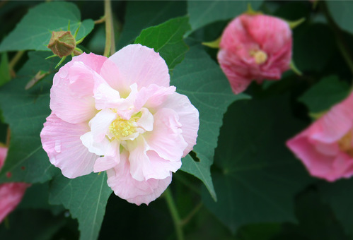 简介:木芙蓉为锦葵科木槿属木本植物。小枝上有细绒毛;叶片为卵状心形,托叶为披针形,常早落;花单生,花萼为钟形,花冠初为白色或淡红色,后逐渐变为深红色;果实为扁球形,有淡黄色的毛附着。花期8到10月。其花或白或粉或赤,皎若芙蓉出水,艳似菡萏展瓣,故有“芙蓉花”之称,又因其生于陆地,为木本植物,故又名“木芙蓉”。