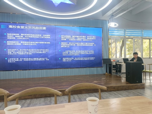 在培训环节,保卫处消防科方钟禹作了《食堂消防安全专职巡查员培训》的报告。方钟禹就高校食堂火灾的种类及危害等级、高校食堂火灾风险因素及隐患排查方法、消防安全专职巡查员职责与任务、消防安全专职巡查员职责与任务等方面做了详细的解读和分析。
