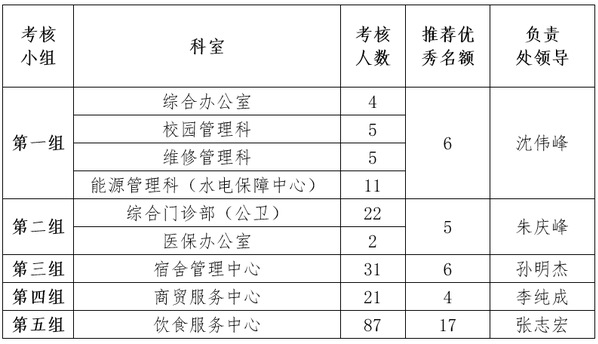 1.根据各科室工作特点及人数,考核分五组进行,每组由一位处领导牵头负责,牵头处领导可根据考核人数再进行分组考核。每组按被考核人数20%的比例分配处(公司)考核优秀推荐指标。具体分组安排如下: