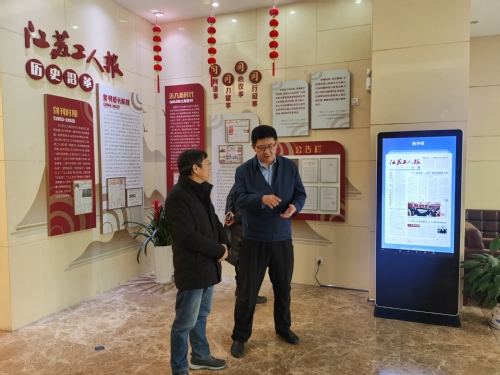 江苏工人报社党委书记、社长、总编戴路对总务处(后勤服务总公司)一行表示欢迎并简要介绍了报社从1952年创刊以来立足于“三工”(工会、工人、工厂)为基层群众发声鼓劲的奋斗历程。2020年以来,报社围绕着站稳传统纸媒主阵地,开辟云端新赛道,增加后浪特色宣传栏,支部建设差异化以及实施市场化改革、竞争性绩效等方式激活干群干事创业积极性。“四同三足”新理念正在引领报社全体人龙行龘龘。朱庆峰介绍了总务(后勤)党建的基本架构,并希望双方今后在党建、新媒体宣传以及总务后勤干部职工先进人物报道等方面深入开展合作,并达成了初步意向。座谈会前,考察组一行实地参观了江苏工人报社的党建活动室、廉政长廊等。