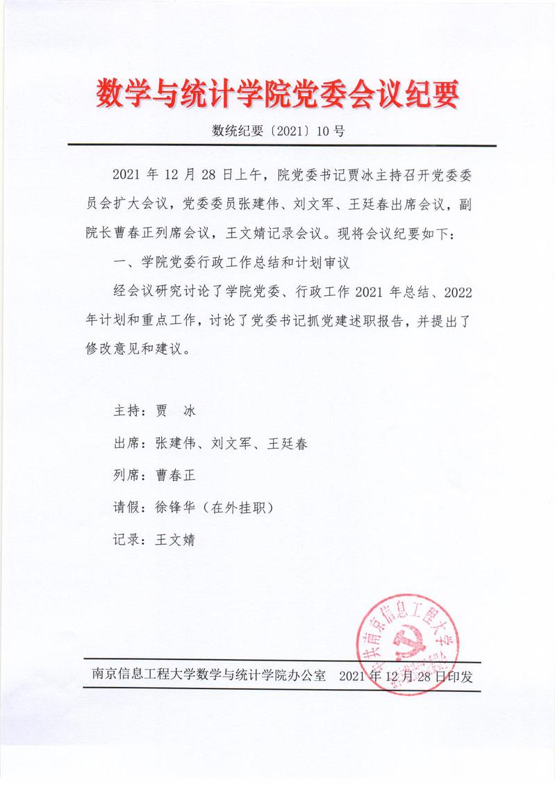 数学与统计学院党委会议纪要〔2021〕10号