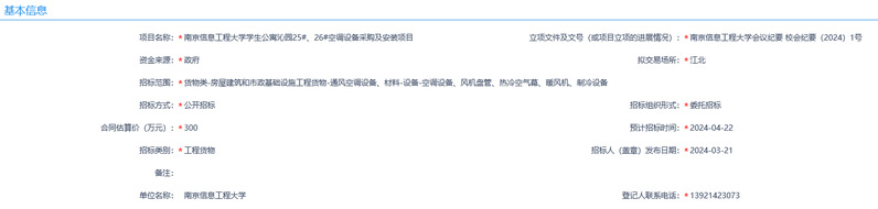 为便于供应商及时了解采购信息,现将南京信息工程大学学生公寓沁园25#、26#空调设备采购及安装项目采购意向公告如下: