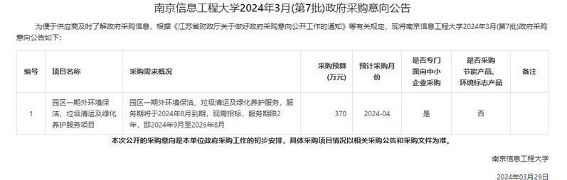 为便于供应商及时了解政府采购信息,根据《江苏省财政厅关于做好政府采购意向公开工作的通知》等有关规定,现将南京信息工程大学2024年3月(第7批)政府采购意向公告如下: