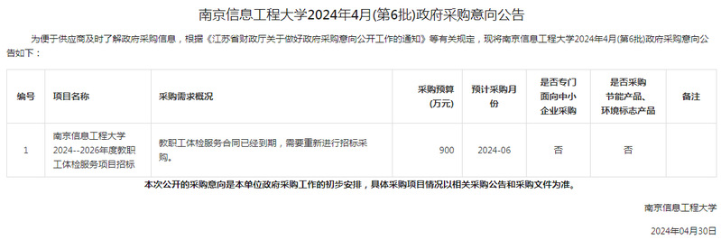 为便于供应商及时了解政府采购信息,根据《江苏省财政厅关于做好政府采购意向公开工作的通知》等有关规定,现将南京信息工程大学2024年4月(第6批)政府采购意向公告如下: