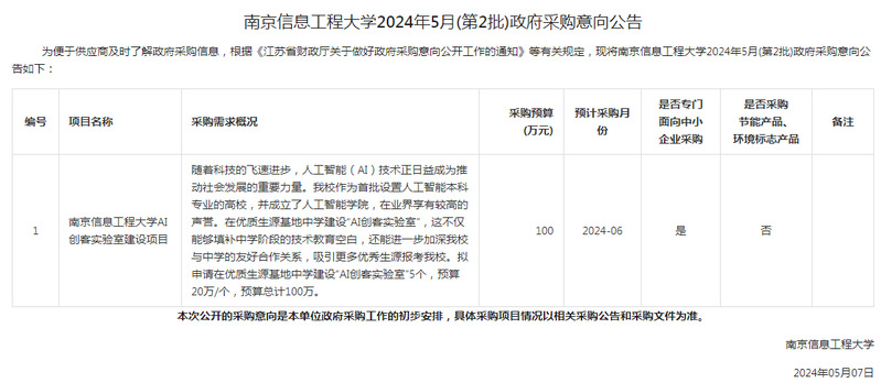为便于供应商及时了解政府采购信息,根据《江苏省财政厅关于做好政府采购意向公开工作的通知》等有关规定,现将南京信息工程大学2024年5月(第2批)政府采购意向公告如下: