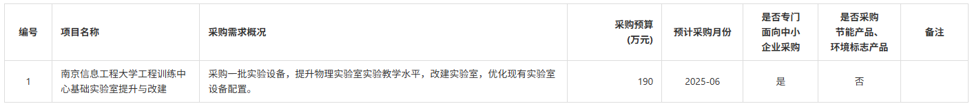 为便于供应商及时了解政府采购信息,根据《江苏省财政厅关于做好政府采购意向公开工作的通知》等有关规定,现将南京信息工程大学2025年5月(第3批)政府采购意向公告如下:
