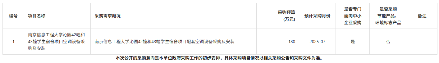 为便于供应商及时了解政府采购信息,根据《江苏省财政厅关于做好政府采购意向公开工作的通知》等有关规定,现将南京信息工程大学2025年6月(第1批)政府采购意向公告如下: