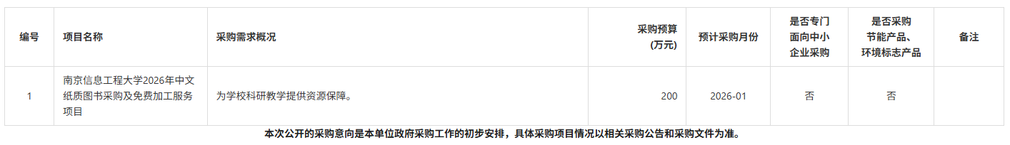 为便于供应商及时了解政府采购信息,根据《江苏省财政厅关于做好政府采购意向公开工作的通知》等有关规定,现将南京信息工程大学2026年1月(第2批)政府采购意向公告如下: