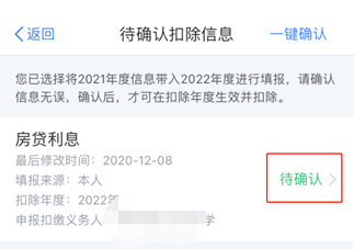 ⑴以修改“房贷利息”为例,在待确认扣除信息页面,点击“待确认”,核对信息。