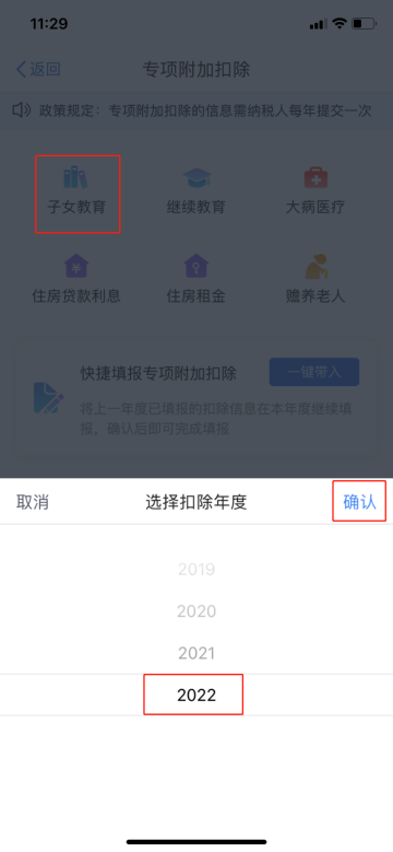 ⑵选“子女教育”-选择扣除年度“2022”-确认;