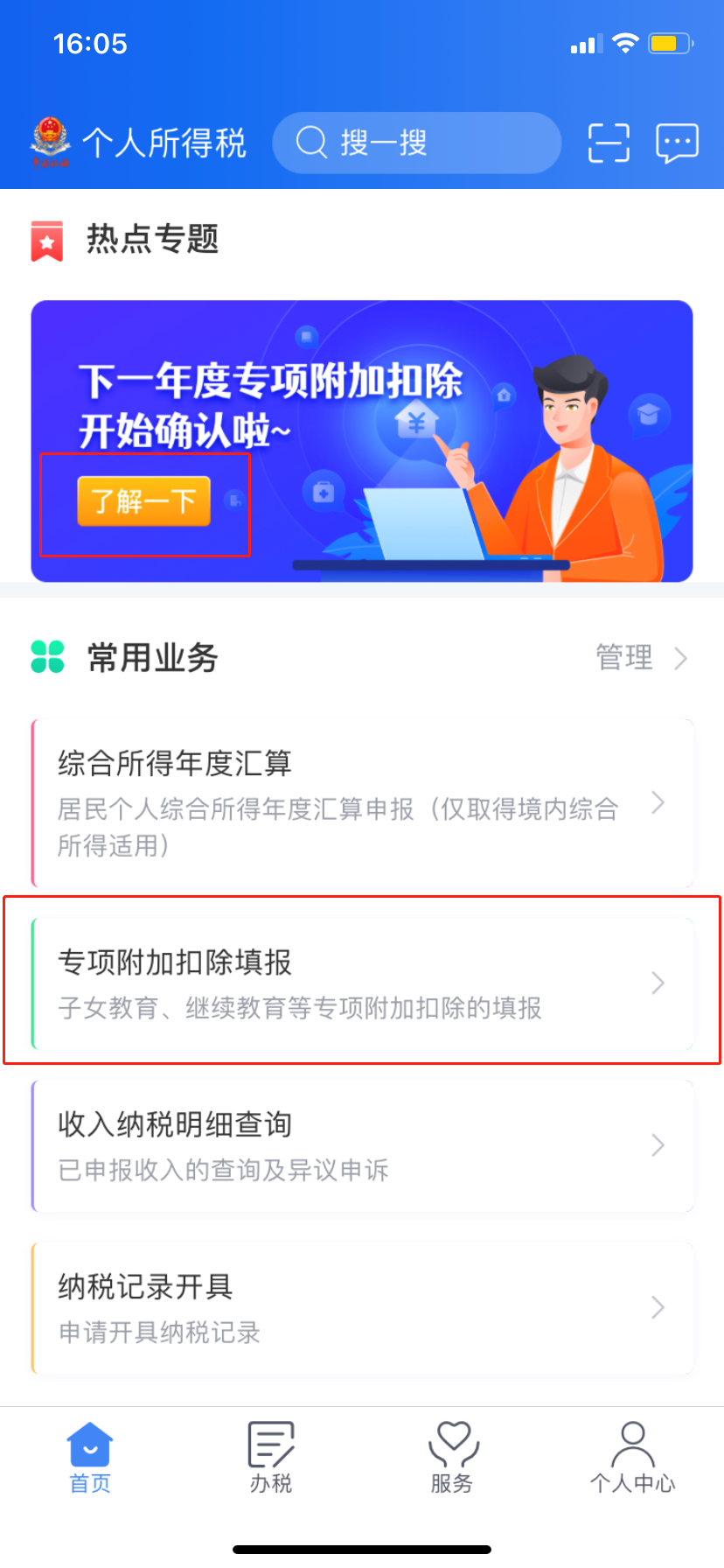 ⑴登录“个人所得税”APP,点击“首页”-专项附加扣除填报