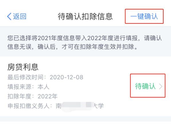 ⑴以删除“房贷利息”为例,在待确认扣除信息页面,点击“待确认”。