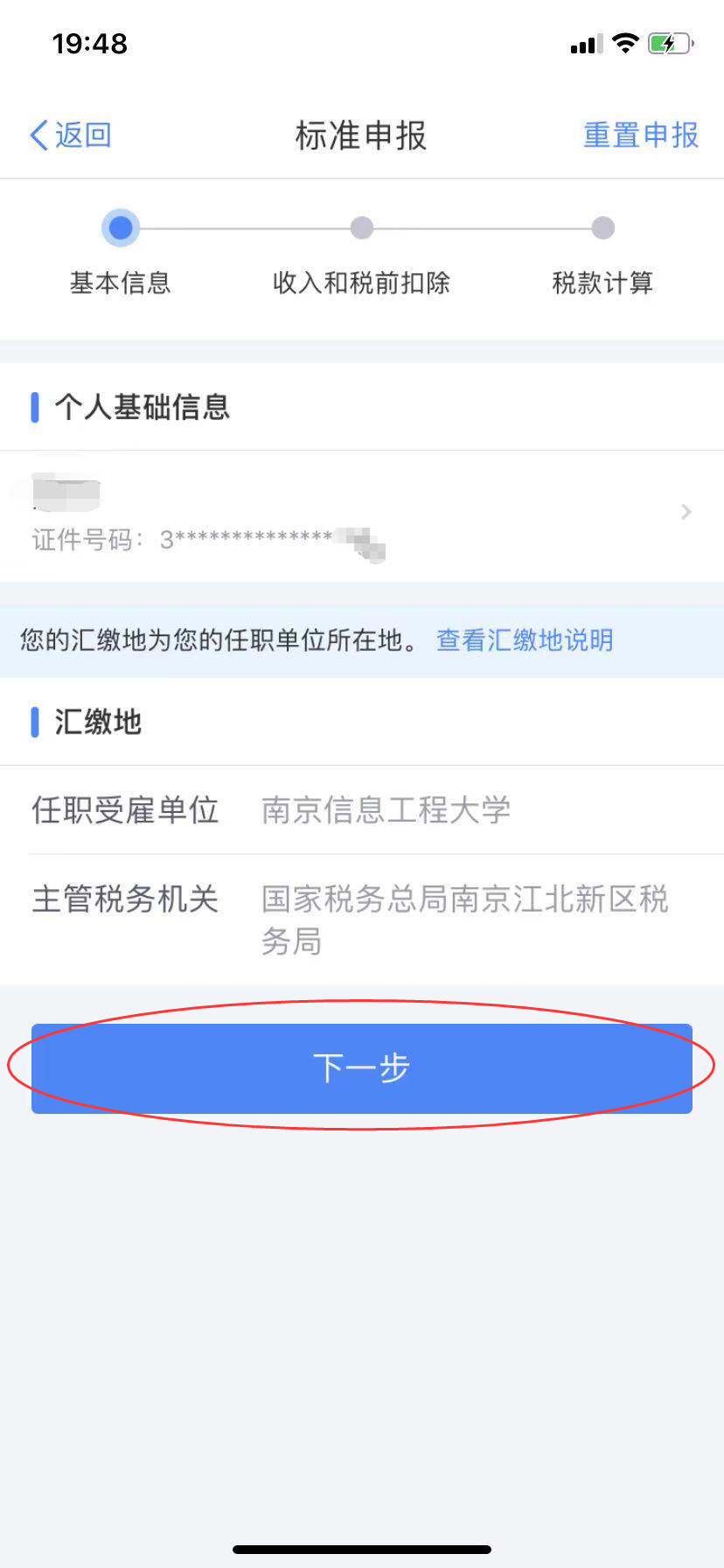 (五)确认“个人基础信息”“任职受雇单位”,确认无误点击“下一步”。