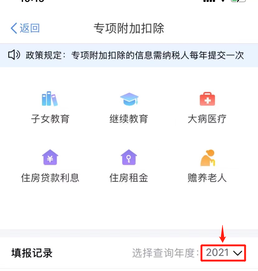 第二步:选择扣除年度“2021”,再选择需要填写或修改的专项附加扣除。
