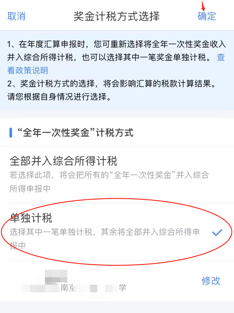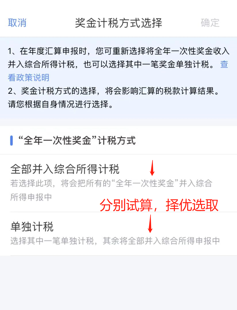点击“工资薪金”-“全年一次性奖金”计税方式有“全部并入综合所得计税”和“单独计税”两种,可以分别试算,选最优方式。