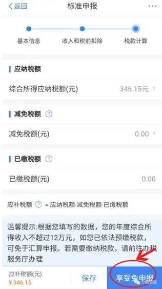 1.税款计算后,查看应补税款,点击“享受免申报”。