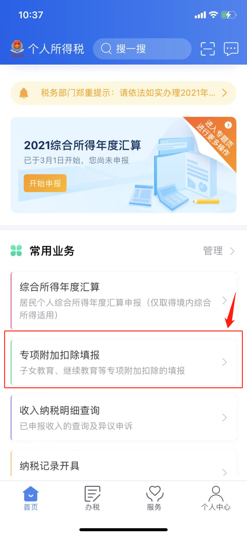 第一步:点击首页“专项附加扣除填报”。