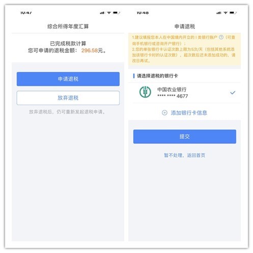 (七)以上所有数据确认无误后,点“下一步”,完成税款计算,可查看退税金额,点击“申请退税”,并选择退税银行卡。