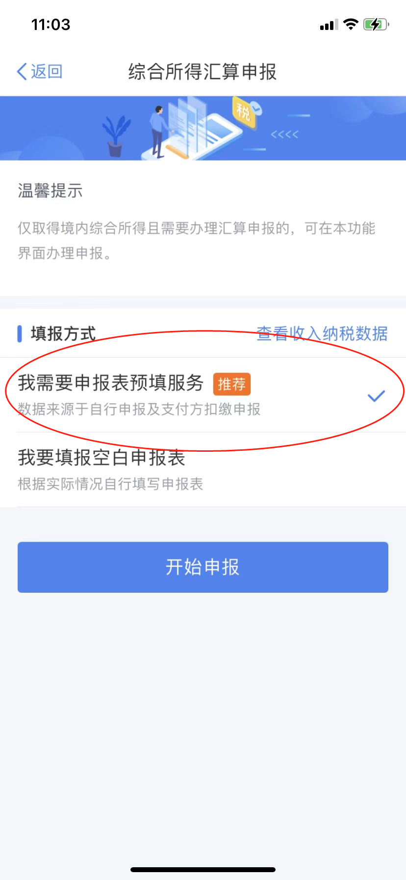 (三)选择填报方式,建议选择“我需要申报表预填服务”→“开始申报”,可快速进行申报。