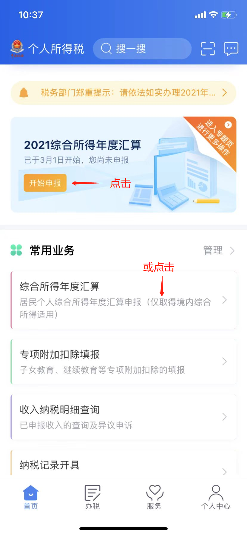 (一)打开并登陆“个人所得税”APP,点击“2021综合所得年度汇算”或“常用业务”下的“综合所得年度汇算”。