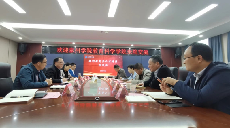 10月6日,泰州学院教务处处长潘小明,师范教育中心主任、教育科学学院党总支书记钱忠相,教育科学学院副院长(主持)刘华一行人来我校交流。我校教务处副处长郭雨、教师教育学院班子成员在揽江楼S601与泰州学院进行教师教育类人才座谈,会议由副院长刘玉柱主持。
