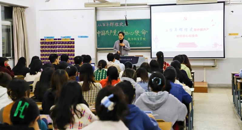 李霞以“从百年辉煌史看中国共产党的初心和使命”为题,围绕“建立中国共产党、成立中华人民共和国、推进改革开放和中国特色社会主义事业”三大里程碑,给学员们讲述了党的百年奋斗史,带领积极分子在学习党的发展历程和新中国建设中寻找和深刻理解党的初心和使命。她表示,党的二十大刚刚闭幕,党的二十大报告指出“我们正意气风发迈上全面建设社会主义现代化国家新征程,向第二个百年奋斗目标进军,以中国式现代化全面推进中华民族伟大复兴。”她指出,中国共产党的百年奋斗,先后肩负起了“民族独立、人民解放”和“国家富强、人民幸福”的两大历史任务,但无论在什么阶段,遭遇如何的挫折,都是以“为中国人民谋幸福、为中华民族谋复兴”为初心和使命。新征程是充满光荣与梦想的远征,我们要充分理解和认识党的二十大报告中提出的“中国式现代化”的深刻内涵,牢牢把握新时代、新征程的使命任务,以党的二十大精神为指引,围绕“教育强国”目标,争做“有理想信念、有道德情操、有扎实学识、有仁爱之心”的好老师,矢志不渝为党和人民奉献出青春之力。