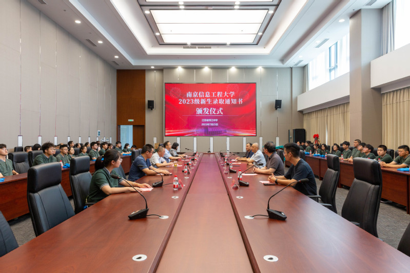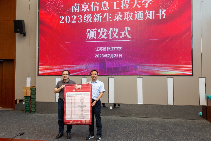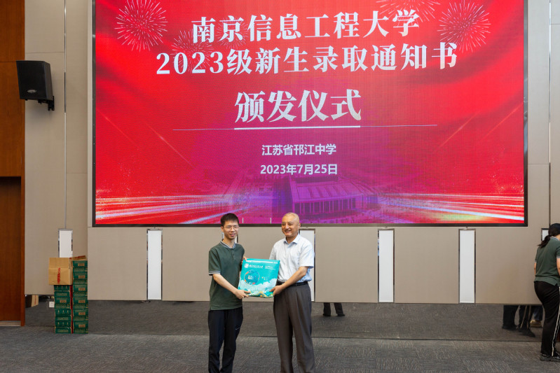 接下来,教师教育学院院长杨作东向邗江中学副校长陈军呈送了喜报,韦校长将录取通知书亲手交给了每一位新生,与他们一一握手表示祝贺并合影留念。胡雨萱同学作为新生代表进行发言,她感谢了母校的栽培和南信大的关怀,并承诺会在大学里积极提升自我,做好规划,努力成为胸怀大志,担当责任的四有青年。整个仪式在大合影中落下帷幕。