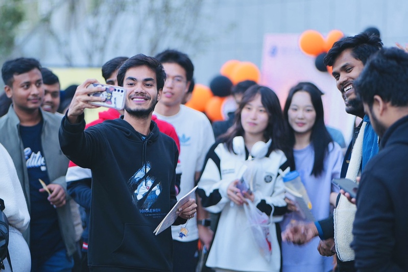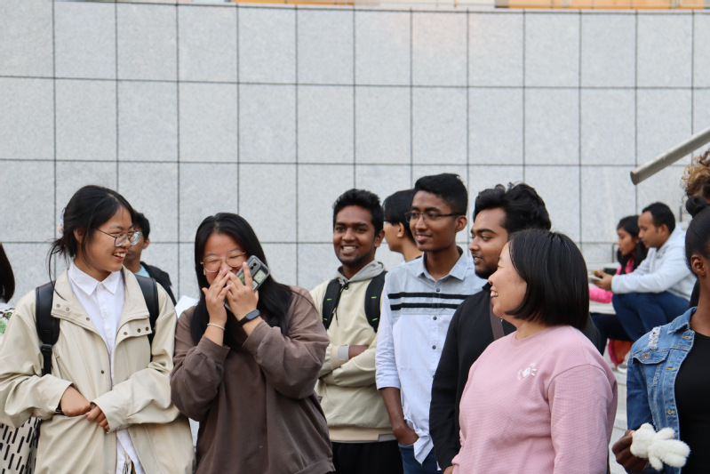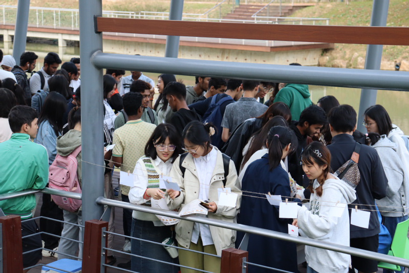 古筝竹笛响起,汉语英语共话。活动伊始,学院为同学们准备了古筝弹奏、英文歌曲弹唱、快板表演等节目,在音乐声中,大家逐渐放松,彼此开始尝试交流。在水边平台,挥毫笔墨的书法展示引得留学生们围观,不少留学生跃跃欲试,写出他们的中文名并拍照留念,有的留学生写下英文或家乡的语言来表达自己的心情。