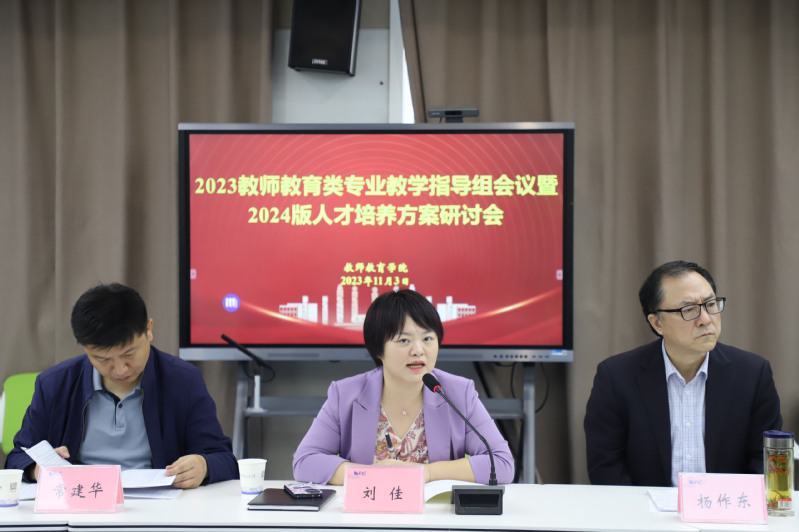 会议首先由刘佳处长宣布新一任教学指导组成员名单。刘处长充分肯定了教师教育学院发展成绩,并在发言中指出,教师教育学院虽然成立时间不长,但发展较快,办学效益彰显。今年又入选国优计划,在全国的教师教育学院中具有一定的知名度。刘处长强调,为提升我校的教师教育人才培养质量,落实教师教育专业“共同培养、协同培育、三相结合”的人才培养机制,制定教师教育学院新的2024版人才培养方案,方案应注重教育特色。希望各专业学院与教师教育学院一起密切合作、统筹组织、认真谋划,共同做好教师教育专业人才培养方案的审定、课程的安排,把控好教师选聘、教学指导、专业评估、学生发展等工作。