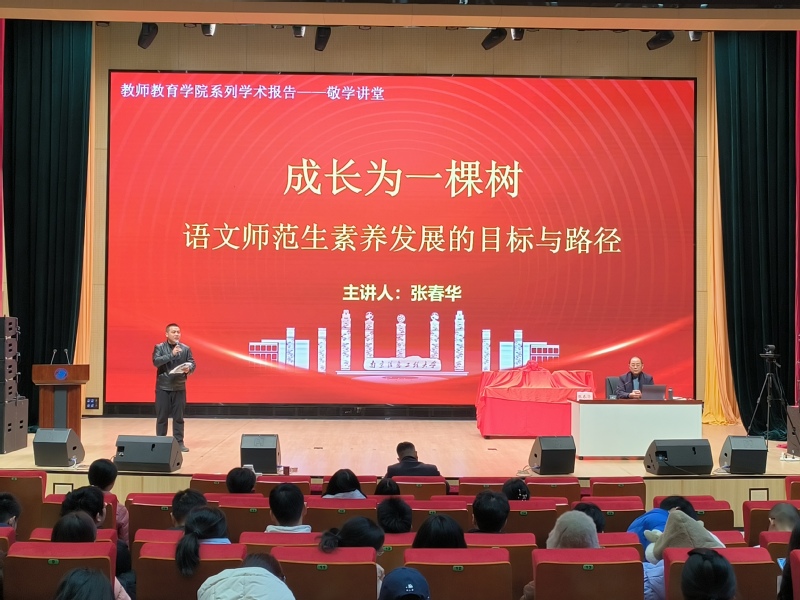 冬日专家精心指导话素养,师院学子用心倾听明方向。为提升语文师范生专业素养,了解一线教育动态,明晰未来职业发展道路,12月3日下午,教师院第22期“敬学讲堂”在信息科技大楼D区报告厅开讲。无锡市教育科学研究院副院长张春华以《成长为一棵树——语文师范生素养发展的目标与路径》为题作报告。21、22级汉语言师范专业全体同学以及部分语文学科教育硕士生聆听讲座,课程与教学系系主任汲安庆老师出席,方超群老师主持报告。