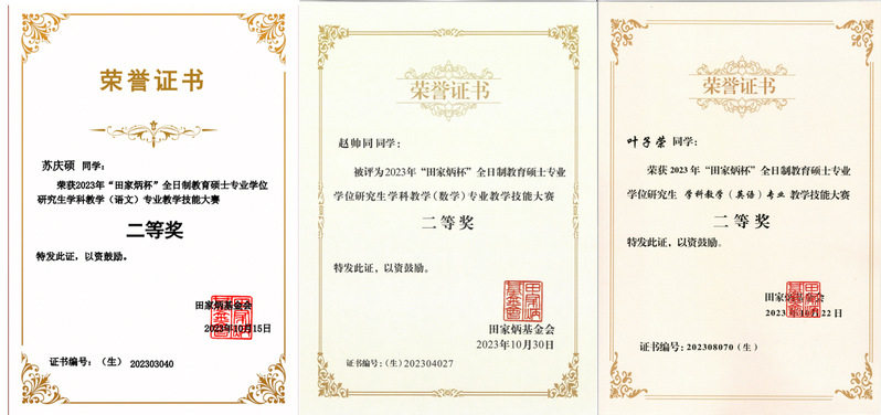 2023年5月至12月,全国“田家炳杯”全日制教育硕士专业学位研究生学科教学技能大赛17个专业方向的比赛陆续进行。我校在此次比赛中取得了优异的成绩,15名同学参赛,其中8名同学成功晋级全国总决赛。在全国总决赛中,我校学科教学(语文)方向苏庆硕、学科教学(数学)方向赵帅同和学科教学(英语)方向叶子荣三位同学经过激烈角逐,分别荣获所在学科方向教学技能大赛全国总决赛二等奖。汲安庆、孟春国和高翔三位老师在此次比赛中获“优秀指导教师”荣誉称号。