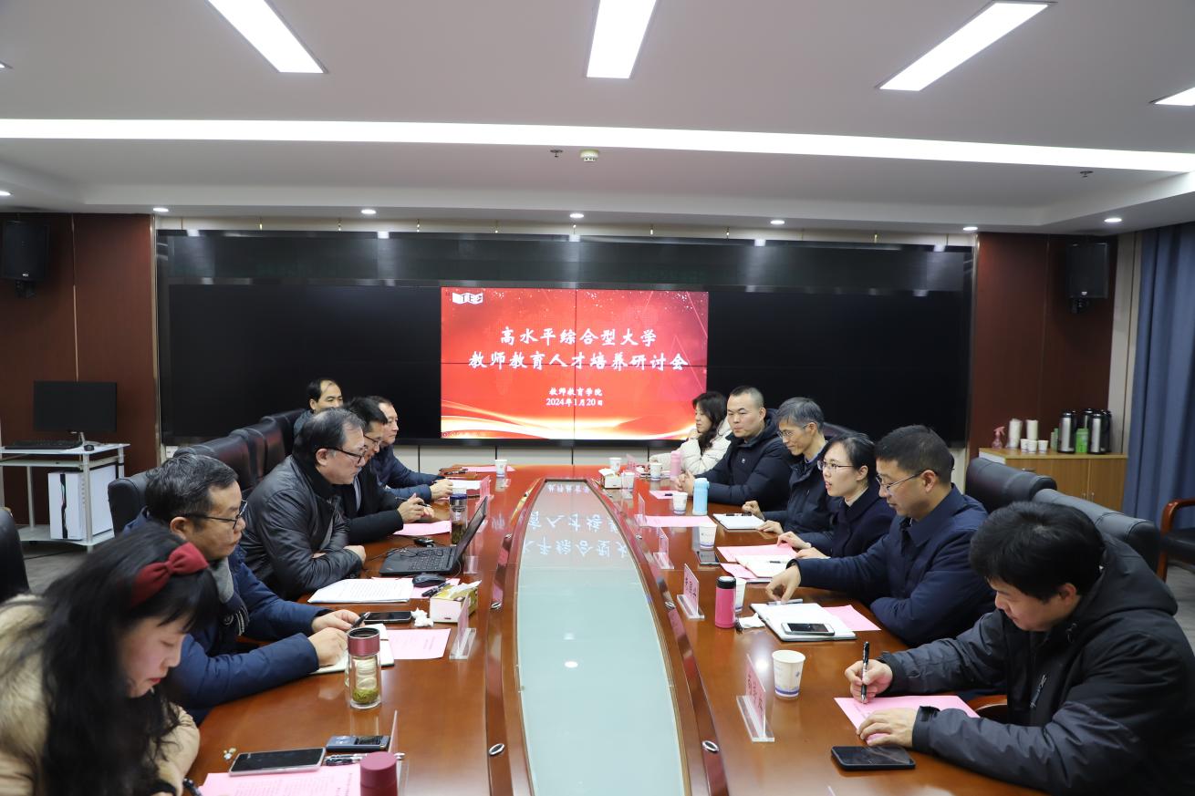 近日,江苏大学师范教育中心协同相关学院教学院长、系主任、骨干教师一行来我院进行教师教育人才培养研讨交流。交流会在揽江楼S601会议室召开。教师院院长杨作东、副院长刘玉柱,院长助理刘铭、办公室主任张惠芳和各专业负责人参加研讨会。会议由副院长刘玉柱主持。