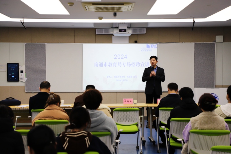 交流期间,陈新荣处长一行还就近期南通市教育局直属学校暨部分市属事业单位委托公开招聘教师岗位做了专场宣讲,他向参加宣讲的同学们介绍了南通当前城市发展现状、基础生活服务、优质教育资源等方面的情况,并详细解读了此次招聘的岗位需求及选聘流程,并对报名流程和材料准备做了专门提醒。