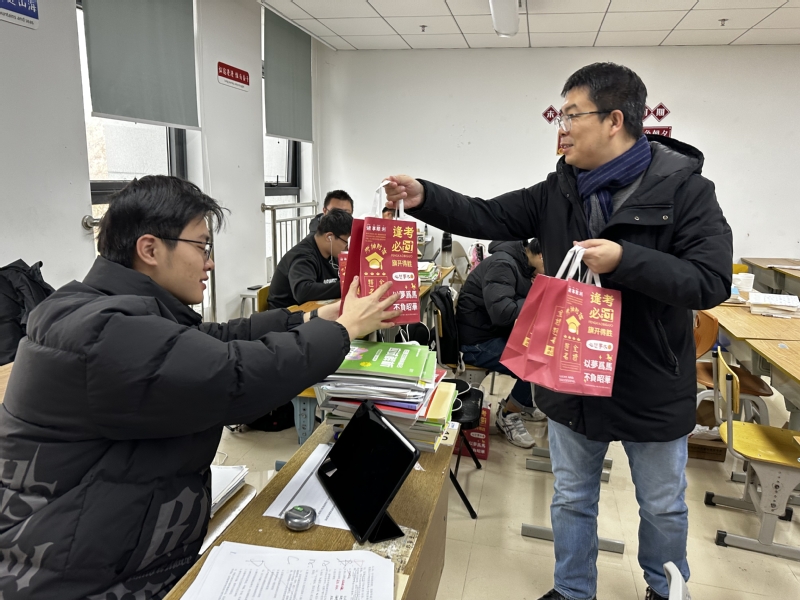 暖心传情,助力逐梦。为深入了解学院2025届考研学生的考前状态,缓解考研压力,提振备考信心,12月13日上午,教师教育学院党委副书记、副院长霍晓音及毕业班辅导员王峰前往学院考研自习教室,为学生发放“加油礼包”,鼓舞士气。