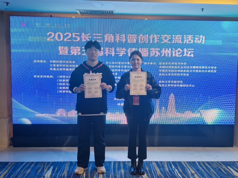 2025年11月1日,由长三角科普创作联盟、江苏省科普作家协会、苏州大学等多家单位联合主办的“2025长三角科普创作高峰论坛暨第五届科学传播苏州论坛”在苏州隆重举行。南京信息工程大学教师教育学院2024级科学与技术教育硕士研究生张冰燕和2025级学科教学(物理)硕士研究生胡铆寅同学应邀参会,其投稿论文在论坛中脱颖而出,双双获评“优秀论文”。